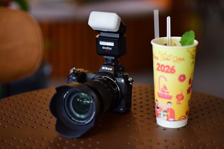 The top panel hosts the mode dial, shutter button, and LCD display for quick access to settings. Familiarizing yourself with these elements is crucial for efficient operation and maximizing the camera’s potential.